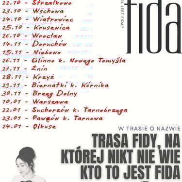 Aktualnie jestem w trakcie mojej pierwszej trasy koncertowej o nazwie: "Trasa Fidy, na której nikt nie wie kto to jest Fida"! Bardzo Wam dziękuję za to, że chcecie się ze mną spotkać na koncertach i że mogę Was poznać. Każdy koncert, dzięki Wam, jest wyjątkowy.